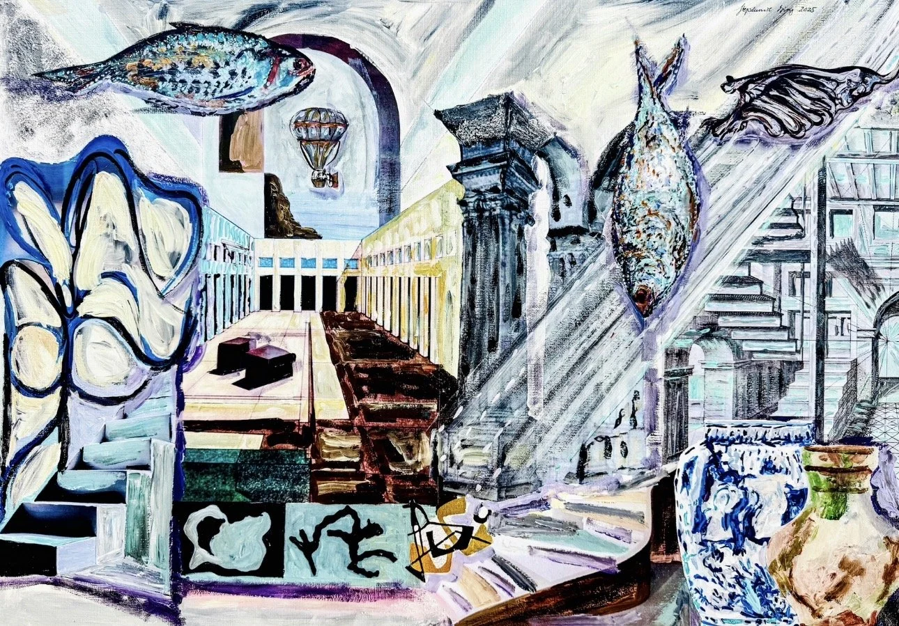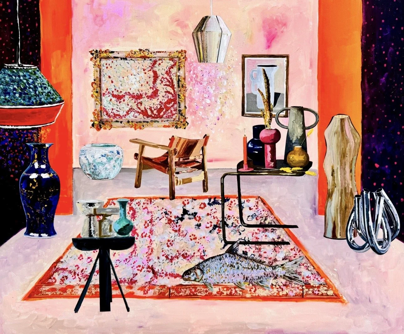 Her work also engages with questions of identity and belonging, though often indirectly. The interiors she constructs are not portraits in the traditional sense, yet they are deeply personal and psychological. They are “rooms of the self,” filled with symbols that speak to perseverance, curiosity, and an insistence on beauty as a form of resistance. At the same time, these spaces remain open, never fully closed narratives; they are designed so that viewers can project their own stories, associations, and emotional histories onto them. In this way, each painting becomes a shared territory, a meeting point between the artist’s inner world and that of the audience.