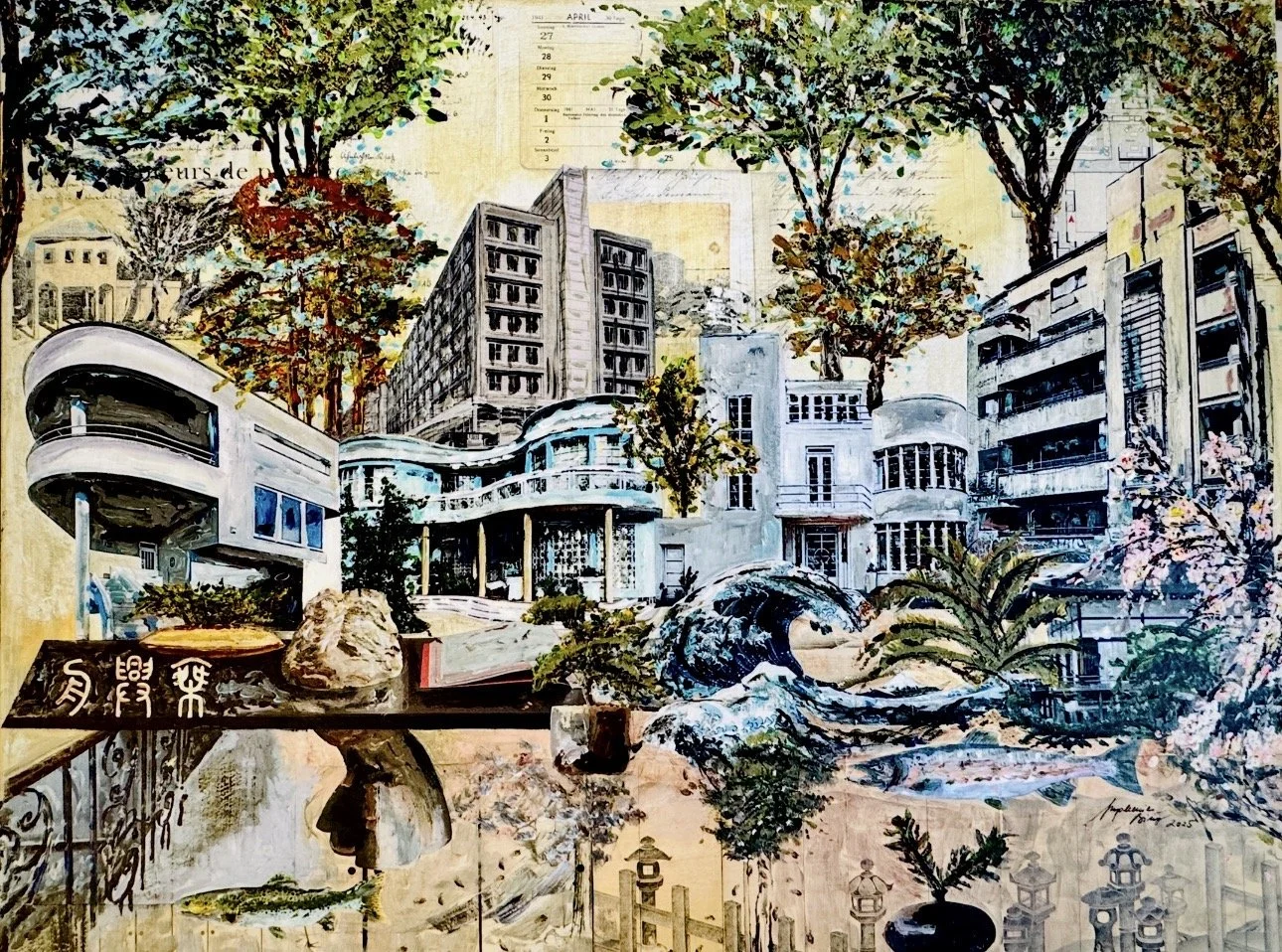 Process is central to this ethos. Bing paints as a daily practice, an act she likens to breathing. Beginning with a conception of space, she constructs an interior framework that she then “wallpapers” with pattern, imagery, and glaze. Over time, she builds up a subtle architecture of shadows and complementary colors to intensify luminosity, allowing light to seem as if it emanates from within the painting rather than merely striking its surface. Collaged fragments—photographic details, printed motifs, drawn elements—are integrated and overpainted, so that the border between what is “real” and what is invented becomes porous. This slow, layered method mirrors the way memory and experience accumulate in the mind: nothing is entirely erased, everything leaves a trace.