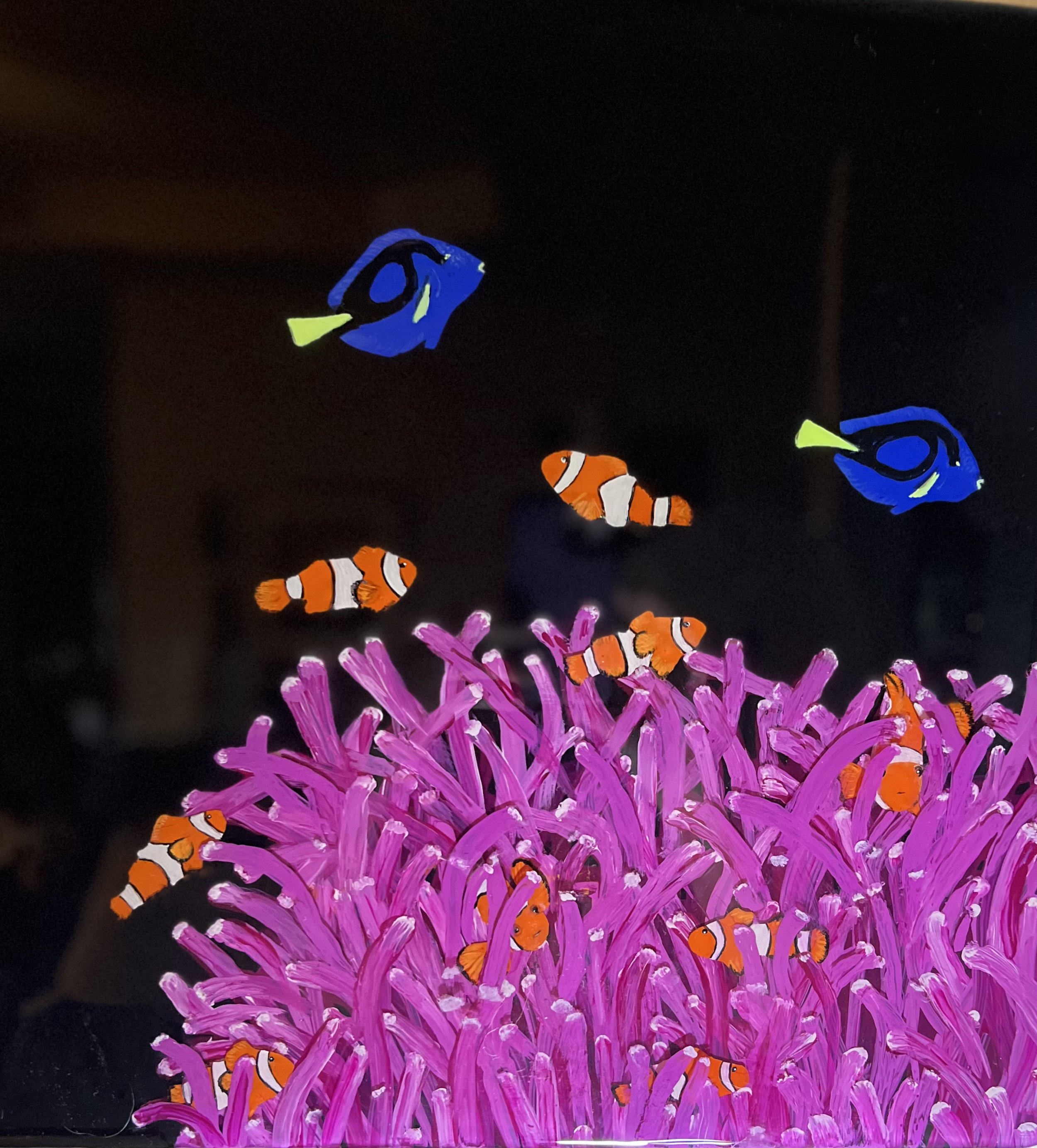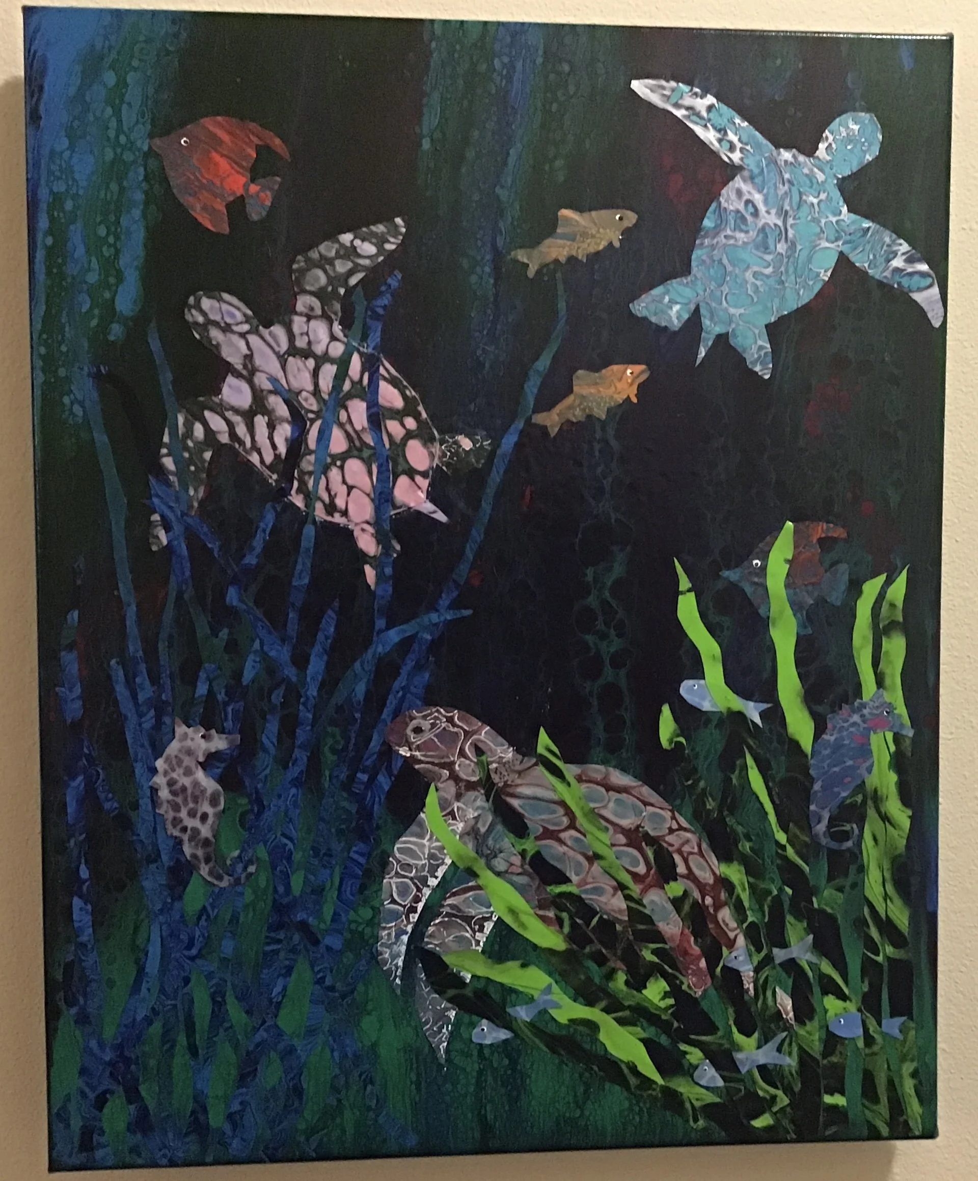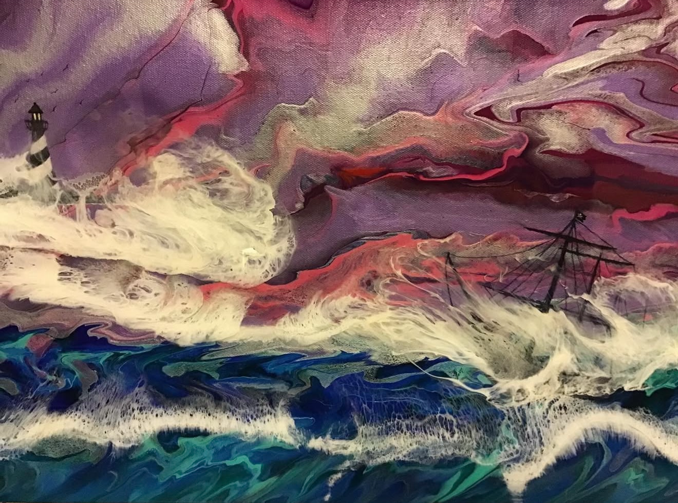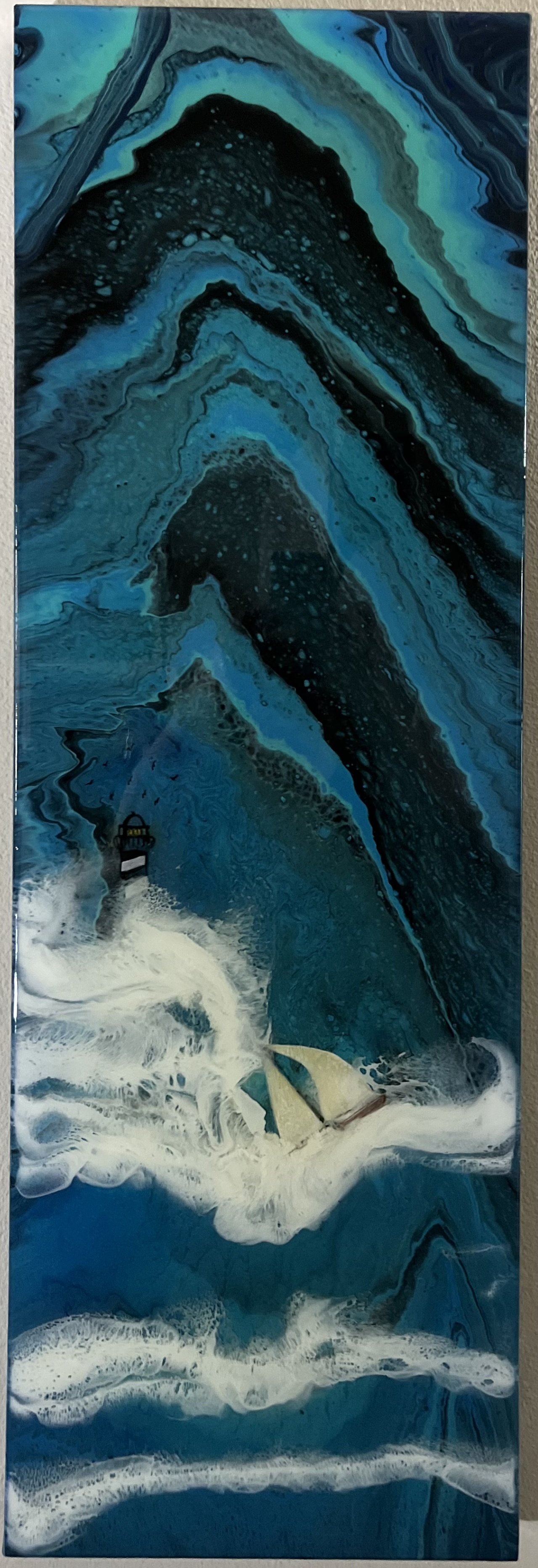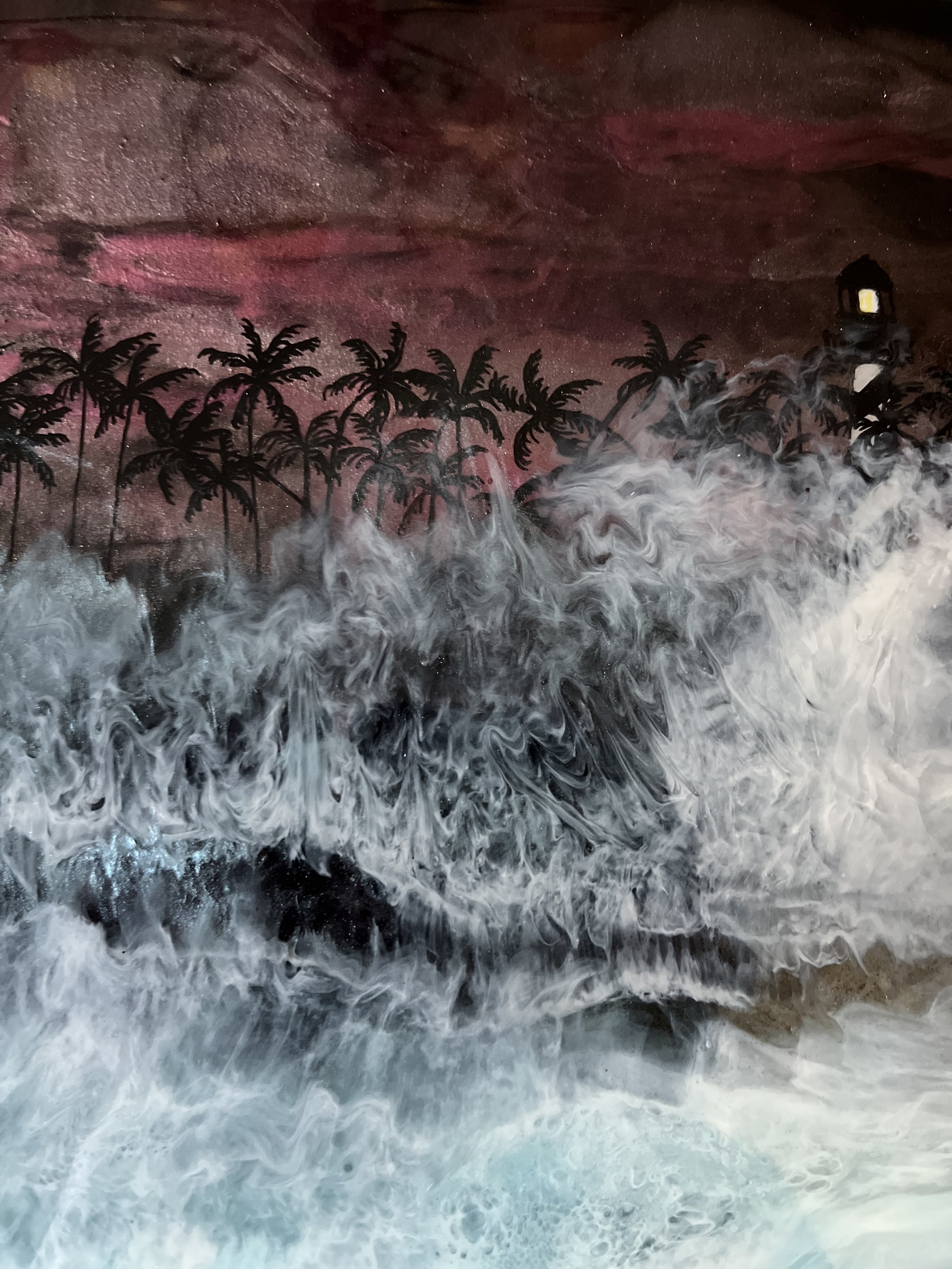 I also work with resin which requires a lot of patience and skill to either use to bring out the colors in your paintings or form the waves crashing in the background of my pieces, or to form 3-D effects in my art. I learn something everyday through trial and error but when I get it right it’s really amazing.