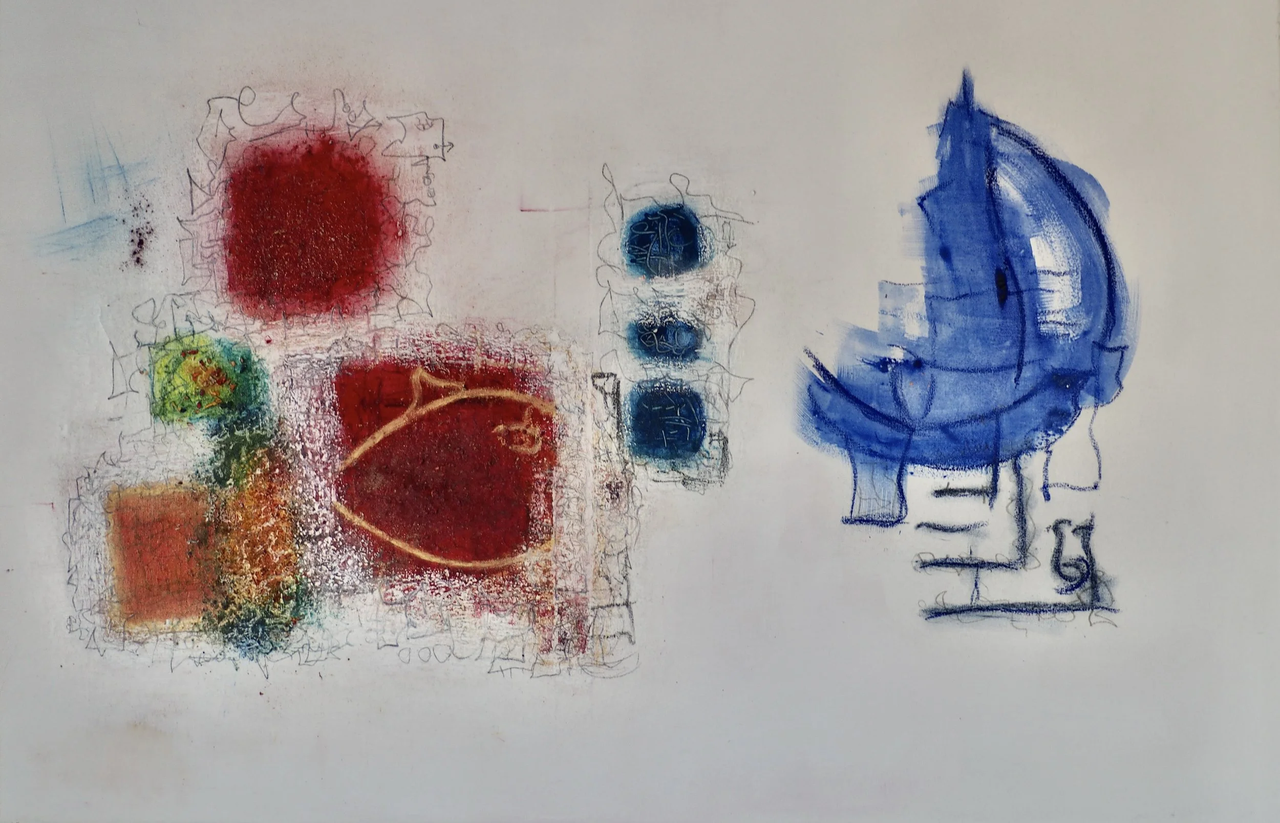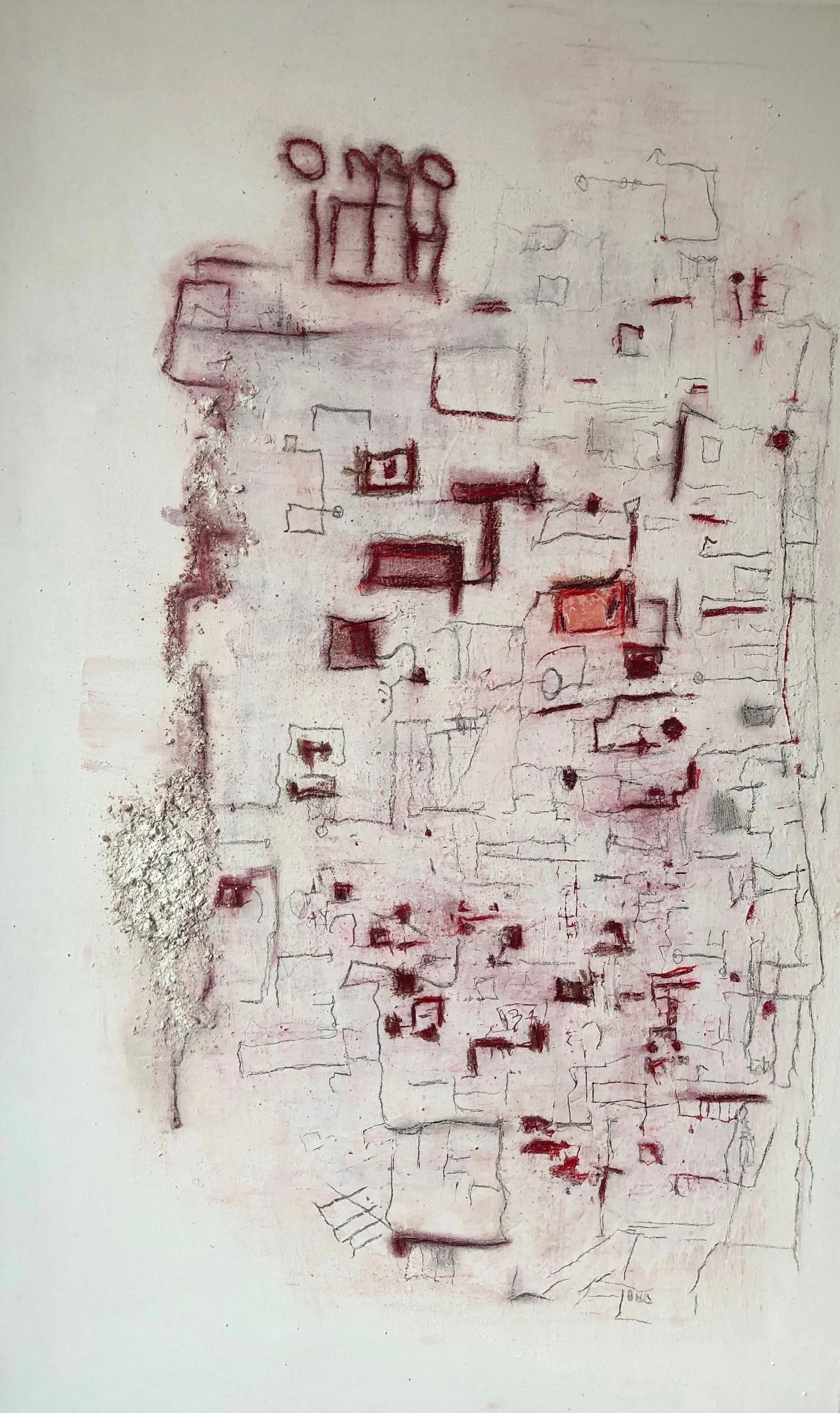 Farbklang Freiburg Berlin 2016-2024, 65,7 x 105,5. Leinwand grundiert mit Gesso auf Holzkeilrahm. Medium: Kreide rot, Ölkreidestift weiß, Bleistift. Bearbeitet mit Metallnadel. Fixativ: Acrylbinder.