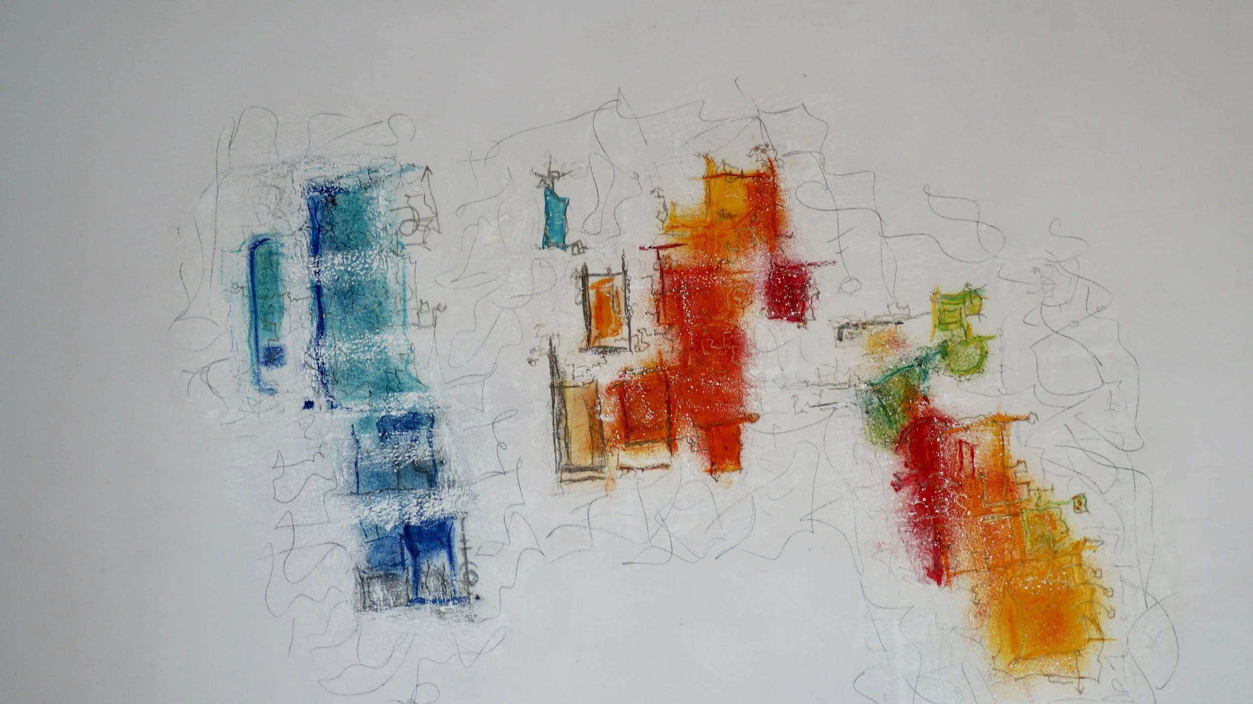 Farbklang3 Berlin 2020,Papier, Acrylmalblock, 360g/qm säurefrei und alterungsbeständig, 29,8 x 39,8 cm. Farben: Kreide bunt, Ölkreide weiß , Fixativ: Acryl Binder