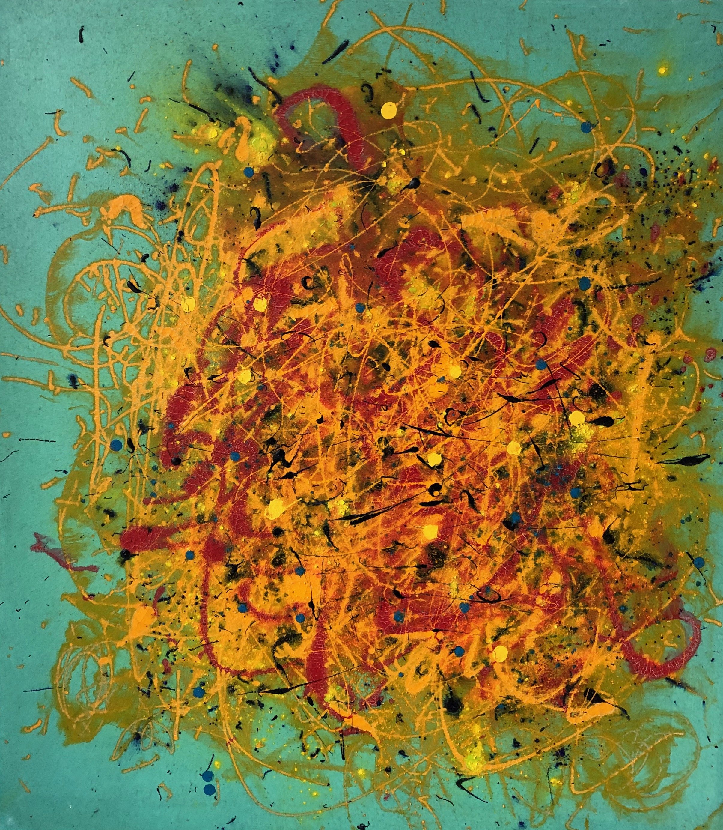 An early work, such as Farbklang Freiburg 2005, presents a dense, circular accumulation of dripped and swung color against a cool turquoise ground. The composition reads almost as a chromatic nucleus, a center of activity from which lines radiate outward. Here, the paint behaves in a physical, almost gravitational manner. The drips and arcs suggest momentum, the traces of motion captured at the moment of suspension. Yet despite the gestural energy, the circular formation introduces a sense of containment. The work becomes a diagram of emotional concentration, where color gathers, intensifies, and forms a temporary center. The turquoise ground provides an atmospheric field against which the warm yellows, reds, and blacks flicker, evoking the sensation of heat against cool air.