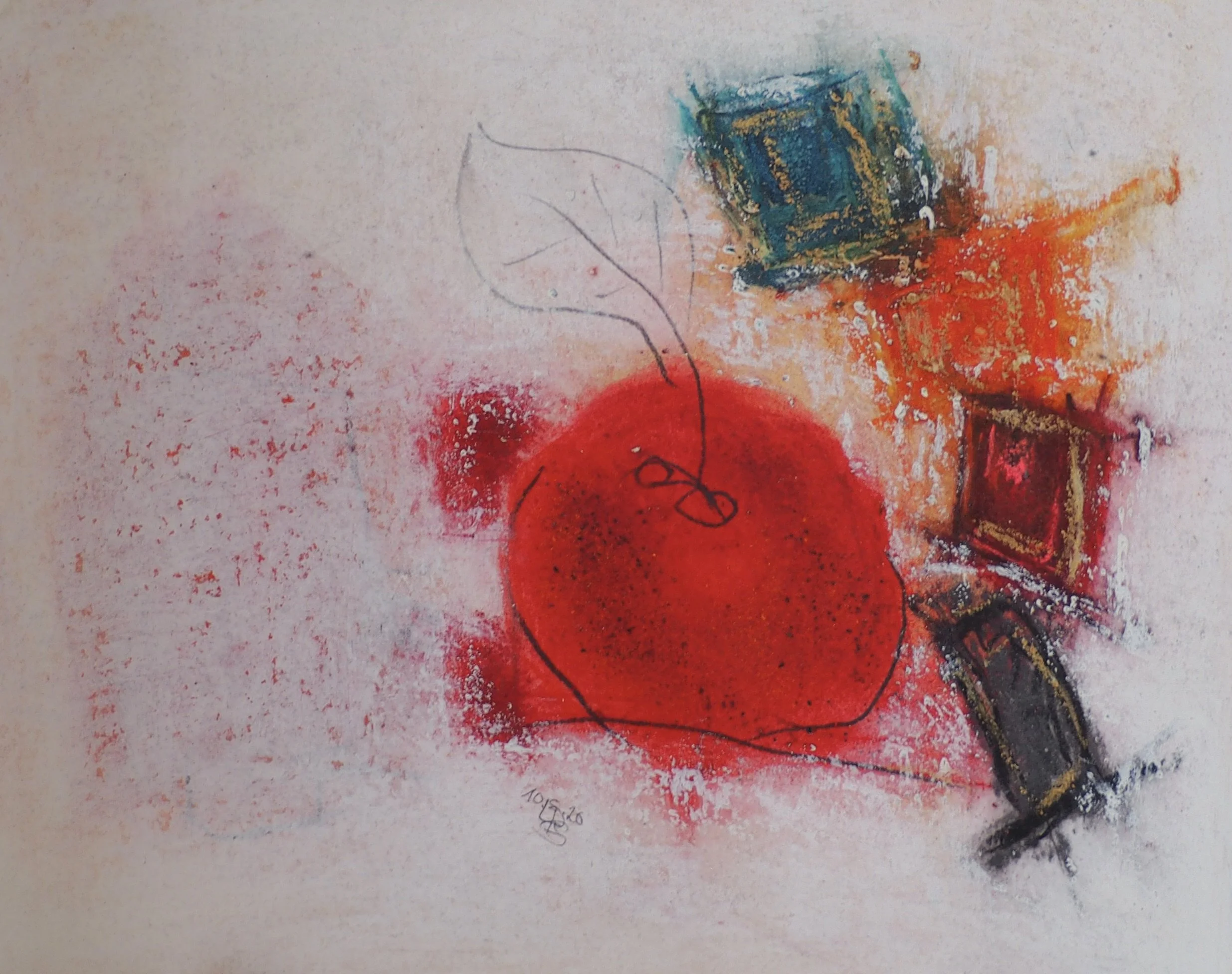 One of the most recent works, Farbklang Berlin 2025, features a large red form accompanied by smaller geometric shapes. The composition feels more direct and concentrated. The red area dominates the surface, suggesting a moment of heightened emotional presence, while drawing lines cross the shape and introduce movement. The painting reads as an event rather than an object, capturing a moment of intensity preserved like a sonic vibration caught in midair.