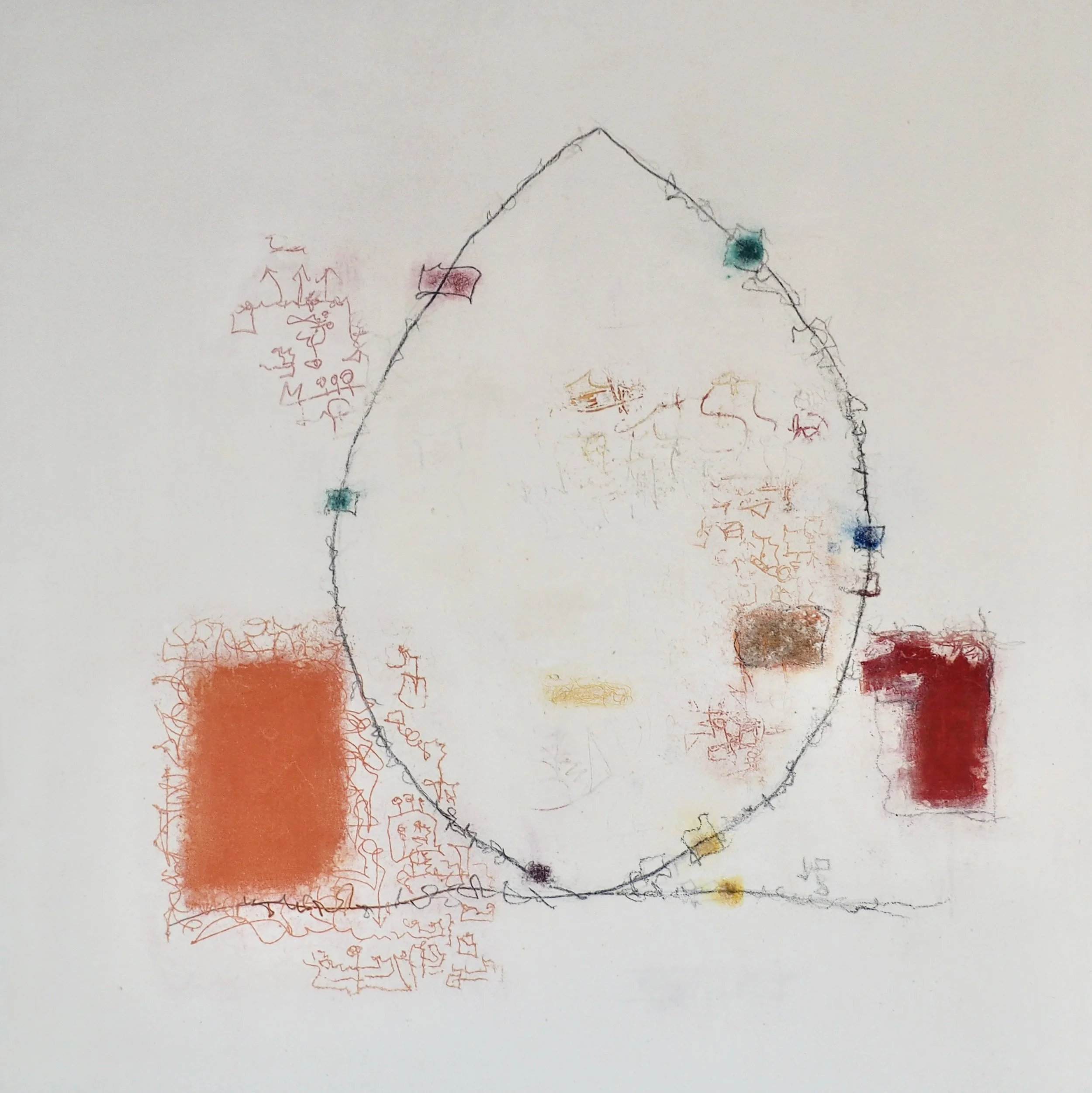 A decade later, Farbklang Freiburg 2015 demonstrates a shift toward more delicate spatial structures. The composition is built from small colored nodes connected by faint lines and soft scribbles, resembling a sequence of notations across the surface. The oval contour that encloses much of the composition introduces a new sense of structure, functioning like a membrane that defines an interior zone of sensation. The palette is subdued and the marks are gentle, so that nothing insists and everything suggests. The work reads almost like a whisper of color rather than a declaration.