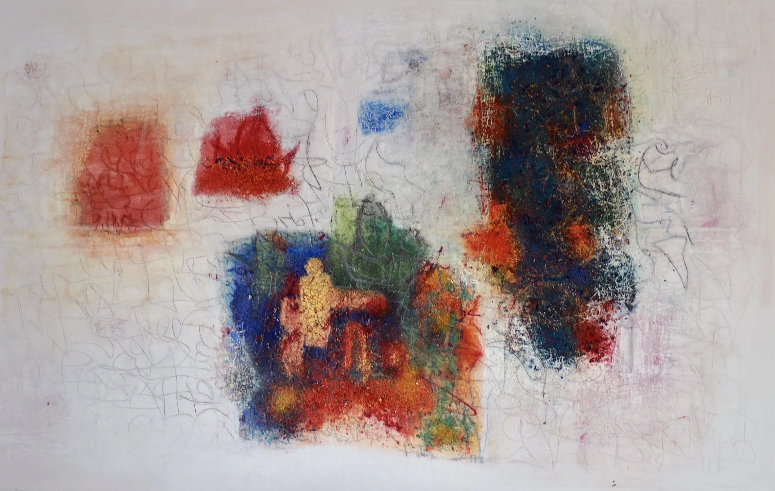 Farbklang Berlin 2019, Leinwand grundiert mit Gesso, auf Holzkeilrahmen 100 x 150, Pastellkreide, Pigmente pur, Bleistift, Ölkreidestift, bearbeitet mit Metallnadel. Fixiert mit Acrylbinder.