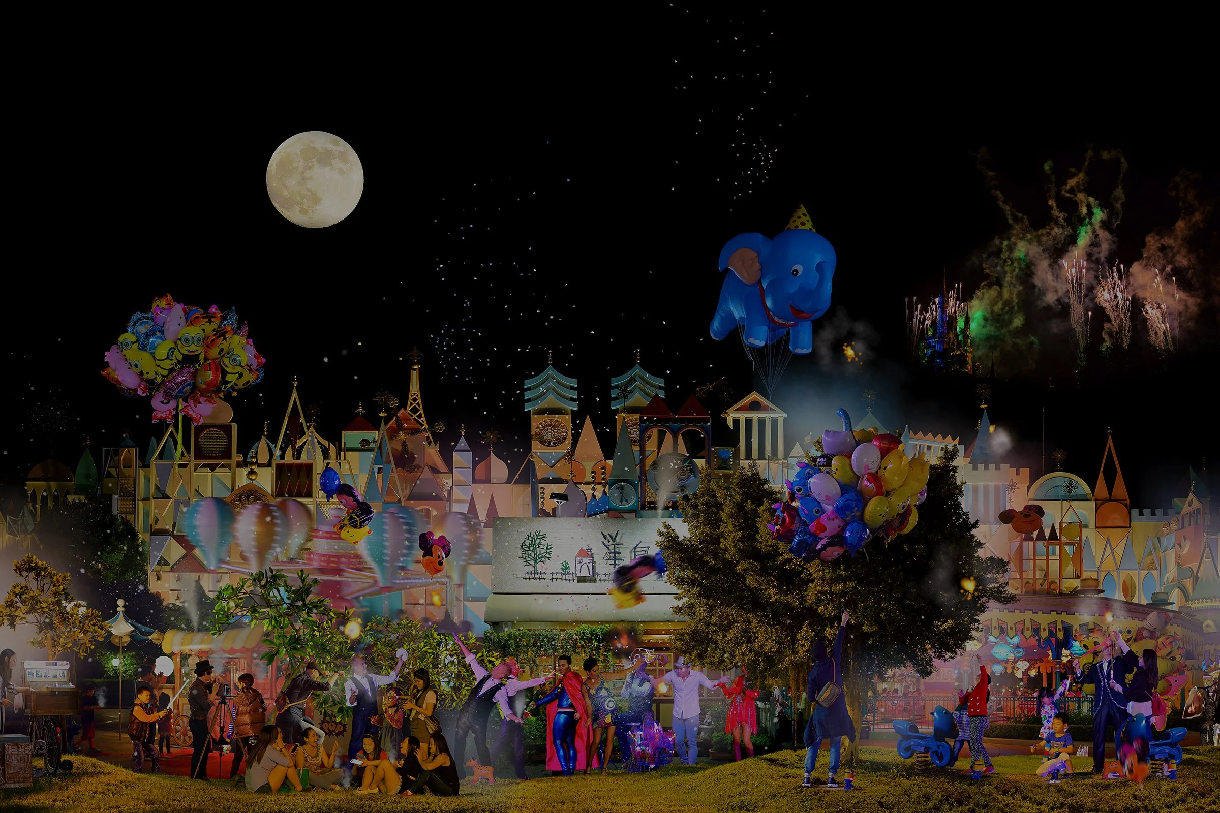 Entering Vinci Weng’s recent work feels less like arriving at an image than like stepping into a constructed situation that is already underway. The first sensation is not simply visual plenitude, though plenitude is everywhere, but a peculiar certainty that what one is seeing has been staged into existence with the deliberation of cinema and the density of painting. Weng’s pictures do not present themselves as windows, nor as documents, nor as the familiar persuasion of photographic immediacy. They behave instead as tableaux with rules, as fictional worlds whose internal physics are established through scale, depth, and chromatic climate. The viewer’s eye is recruited into a traversal that feels at once intimate and infrastructural, moving across crowds, props, animals, balloons, fireworks, architectural fragments, and improbable transitions between night and day, between pastoral and amusement park, between terrestrial gravity and airborne drift. In this sense, the series titles are not ornamental but diagnostic. My Wonderlands, created from 2012 to 2020, and The Enchanted Joylands, begun in 2021 and continuing to the present, announce what the works deliver: not simply fantasy, but a disciplined construction of wonder as an operative mode of seeing.